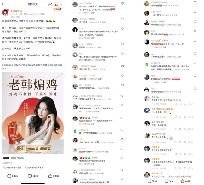 官宣消息一经发布,迅速引发了粉丝和消费者的热烈讨论。线上,粉丝们纷纷在评论区留言表达对此次合作的期待和支持,“期待老韩煸鸡和赵粤的梦幻联动”“以后吃炸鸡就选老韩煸鸡了”“赵粤终于炸鸡自由了”等评论刷屏。老韩煸鸡官方社交媒体账号的粉丝量也在短时间内大幅增长,品牌曝光度和话题热度持续攀升。