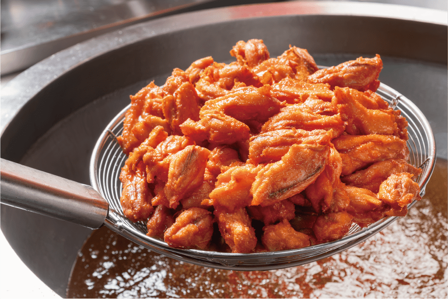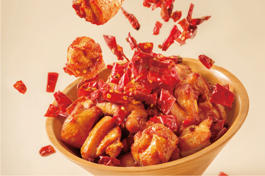 独创“三炸一煸”工艺:一炸出水、二炸初熟、三炸脆皮,油尽煸出,椒香寸入。入口麻辣椒香,一丝回甜。
